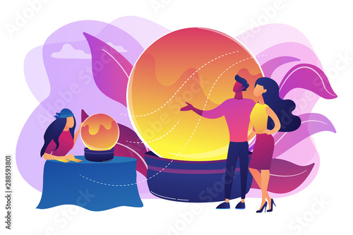 Magical Divination And Cartomancy Gipsy Soothsayer Prophet With Clients Fortune Telling Fortune Teller Online Tarot Reading Services Concept Bright Vibrant Violet Vector Isolated Illustration Buy This Stock Vector And Explore Similar